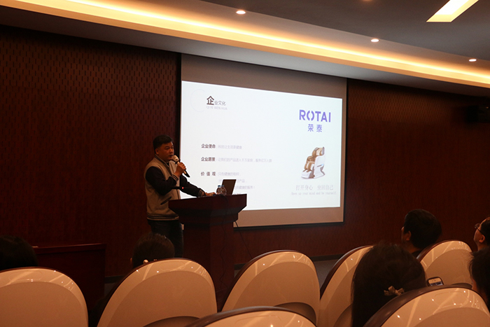 在荣泰健康201多功能会议室,林总向工商联领导及相关参观代表讲解了荣泰健康的企业文化,发展历程等。各位代表对荣泰多功能会议室的按摩椅座表示称赞。