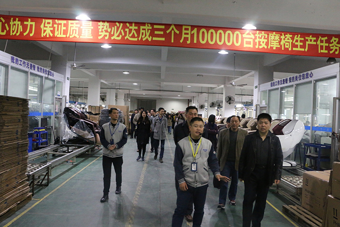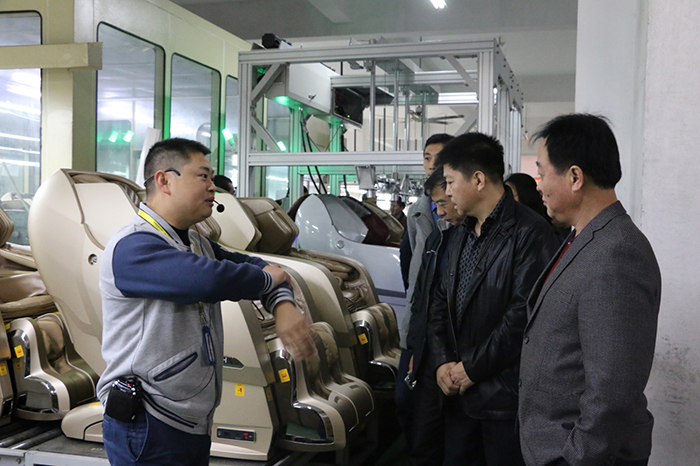 随后,工商联领导在工作人员的带领下参观了制造生产车间,相关部门负责人向各位领导介绍了荣泰自动化生产线的的工作流程,并特别介绍了2017年荣泰上市的新品RT8610S智能语音按摩椅的生产环节和车间成品。