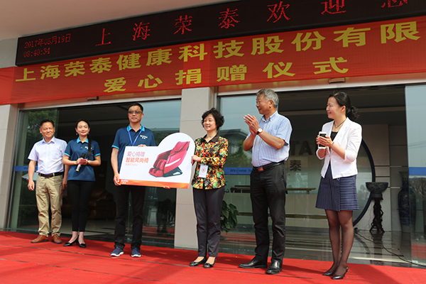 在捐赠仪式上,荣泰健康捐出了26台RT6162智能风尚椅。据了解这些捐出的按摩椅,将分批送往全区各街镇红十字会服务总站及青浦区红十字护理医院,帮助需要帮助的人。为表彰荣泰健康的乐善好施,青浦区及朱家角镇的相关领导,还向荣泰授予 “慈善帮困,爱满人间”奖牌