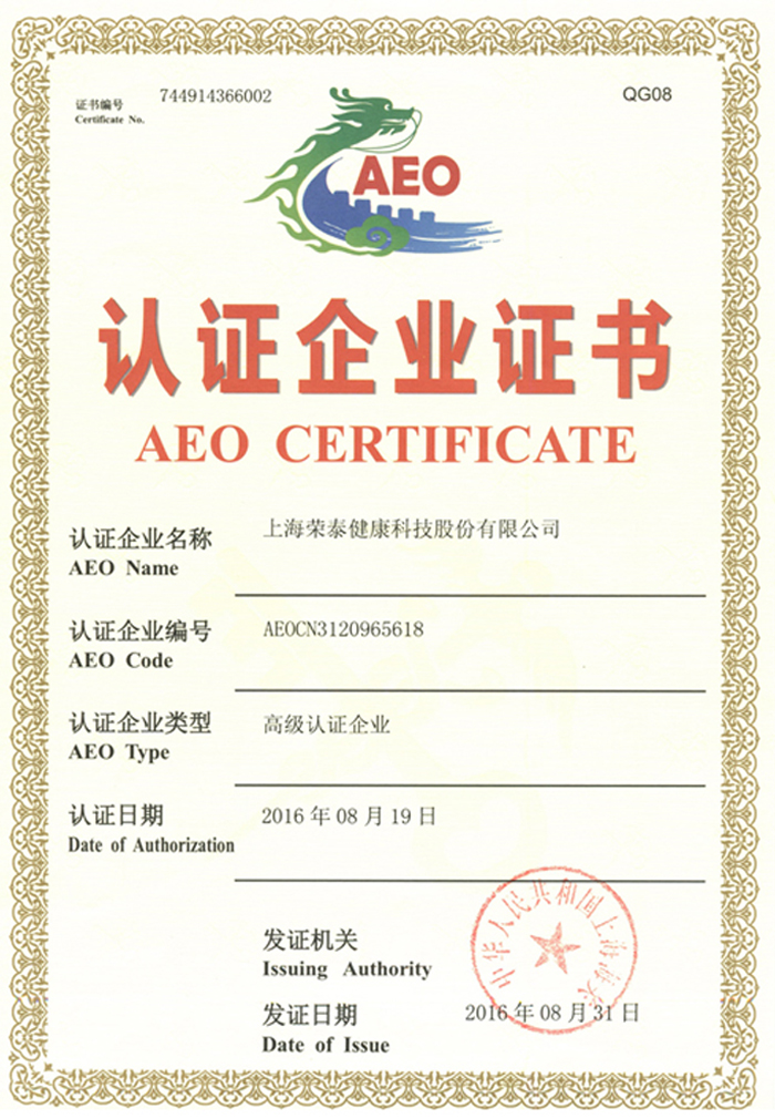 近日,上海荣泰健康科技股份有限公司获得了“海关AEO高级认证企业”证书及牌匾。这意味着荣泰取得了国际贸易最高级别“信用通行证”,将享受更多海关优惠和通关便利。