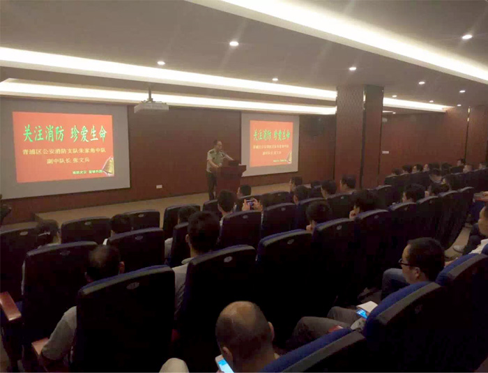 演练之前,青浦区公安消防支队朱家角中队张文兵副中队长给荣泰员工讲解消防相关知识,主要从对火灾案情进行分析、如何防范火灾和正确有效疏散、如何正确使用灭火器以及有效扑救初期火情时间等方面展开。以提高员工安全意识,防患于未然。