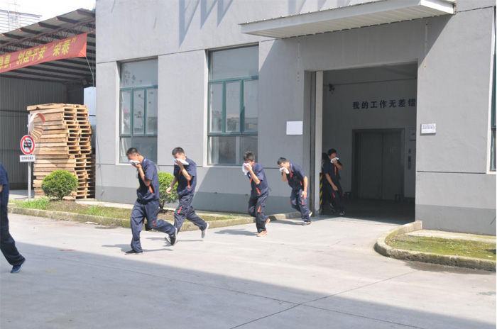 随后进行实地演练,此次演练目的是保障员工生命及公司财产安全。此次演练在荣泰新厂区举行,许多易燃物大量燃烧,大火迅速蔓延,大量员工有序逃离,但仍有两名被困火海。接到报警后,消防人员第一时间赶到了事故现场,并迅速救火、救人。通过消防人员地英勇奋战,被困人员全部安全获救、火也被浇灭。