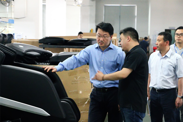在荣泰林琪总经理等高管的陪同下,夏区长一行参观了荣泰现代化的仓库、车间、检测中心、文体中心以及样品展厅。荣泰良好的工作环境、有序的生产流程、一丝不苟的质检过程以及深厚的企业文化给夏区长留下了美好的印象。他对荣泰近年来取得的成绩表示高度肯定和赞许。
